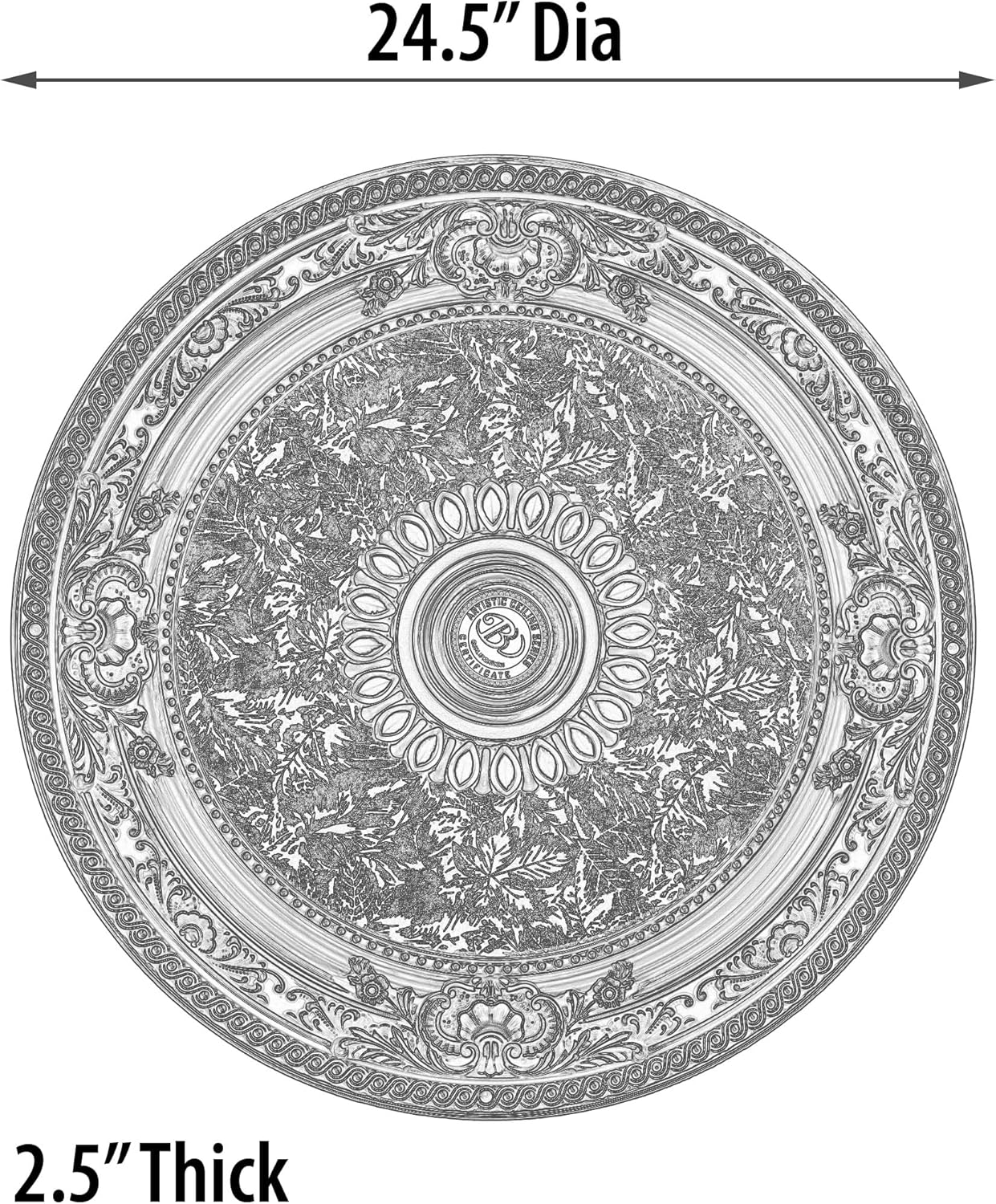 Transform your ceiling into a masterpiece with this exquisite 24.5-inch round ceiling medallion. Featuring an opulent gold finish, this architectural accent showcases intricate floral and leaf patterns that radiate from a stunning central sunburst design. The medallion's elaborate details include a sophisticated rope border trim and ornate Victorian-style scrollwork that adds depth and dimension. The layered construction creates dramatic shadow effects, while the classic design elements complement both traditional and contemporary chandeliers. Perfect for enhancing light fixtures in formal dining rooms, grand entryways, or living spaces, this medallion serves as a stunning focal point that elevates your home's interior architecture. The detailed craftsmanship is evident in every element, from the precisely molded baroque-inspired embellishments to the carefully rendered botanical motifs. This ceiling medallion adds a touch of timeless elegance and European-inspired grandeur to any room's ceiling decor.